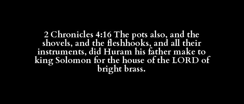 2 Chronicles 4:16 The pots also, and the shovels, and the fleshhooks, and all their instruments, did Huram his father make to king Solomon for the house of the LORD of bright brass.