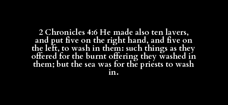 2 Chronicles 4:6 He made also ten lavers, and put five on the right hand, and five on the left, to wash in them: such things as they offered for the burnt offering they washed in them; but the sea was for the priests to wash in.