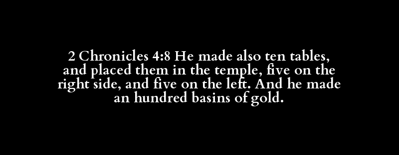 2 Chronicles 4:8 He made also ten tables, and placed them in the temple, five on the right side, and five on the left. And he made an hundred basins of gold.