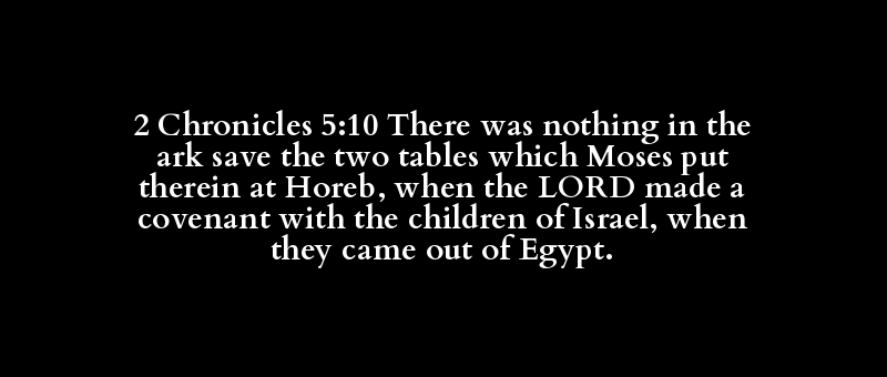 2 Chronicles 5:10 There was nothing in the ark save the two tables which Moses put therein at Horeb, when the LORD made a covenant with the children of Israel, when they came out of Egypt.