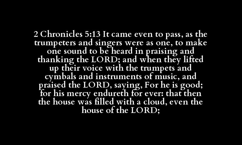2 Chronicles 5:13 It came even to pass, as the trumpeters and singers were as one, to make one sound to be heard in praising and thanking the LORD; and when they lifted up their voice with the trumpets and cymbals and instruments of music, and praised the LORD, saying, For he is good; for his mercy endureth for ever: that then the house was filled with a cloud, even the house of the LORD;
