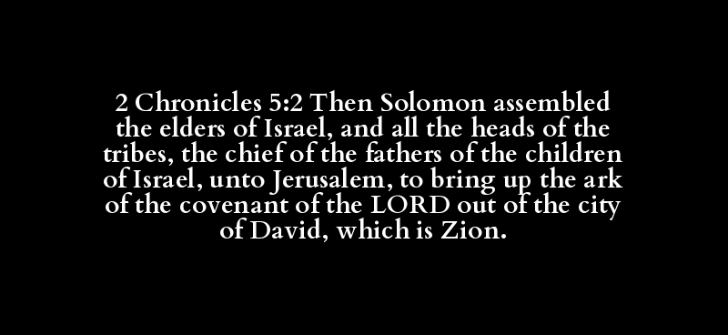 2 Chronicles 5:2 Then Solomon assembled the elders of Israel, and all the heads of the tribes, the chief of the fathers of the children of Israel, unto Jerusalem, to bring up the ark of the covenant of the LORD out of the city of David, which is Zion.
