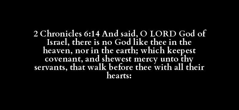 2 Chronicles 6:14 And said, O LORD God of Israel, there is no God like thee in the heaven, nor in the earth; which keepest covenant, and shewest mercy unto thy servants, that walk before thee with all their hearts: