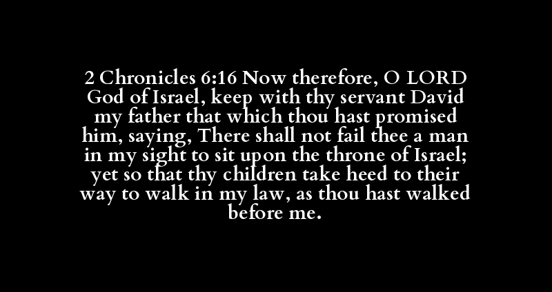 2 Chronicles 6:16 Now therefore, O LORD God of Israel, keep with thy servant David my father that which thou hast promised him, saying, There shall not fail thee a man in my sight to sit upon the throne of Israel; yet so that thy children take heed to their way to walk in my law, as thou hast walked before me.