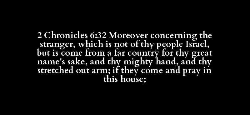 2 Chronicles 6:32 Moreover concerning the stranger, which is not of thy people Israel, but is come from a far country for thy great name's sake, and thy mighty hand, and thy stretched out arm; if they come and pray in this house;