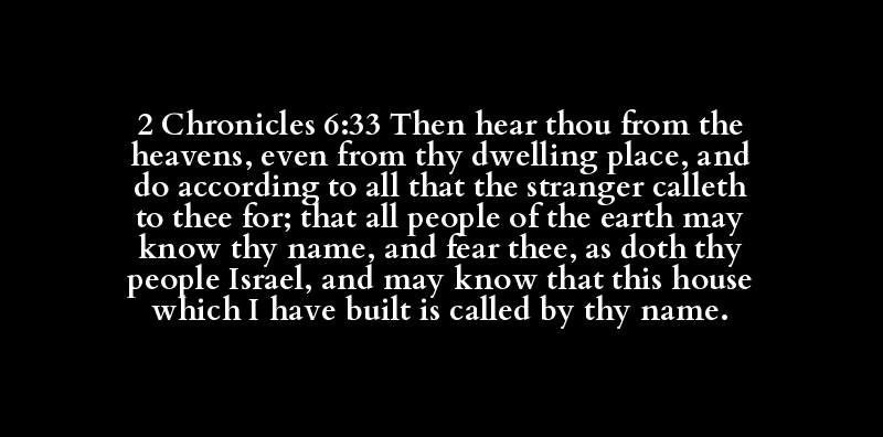 2 Chronicles 6:33 Then hear thou from the heavens, even from thy dwelling place, and do according to all that the stranger calleth to thee for; that all people of the earth may know thy name, and fear thee, as doth thy people Israel, and may know that this house which I have built is called by thy name.