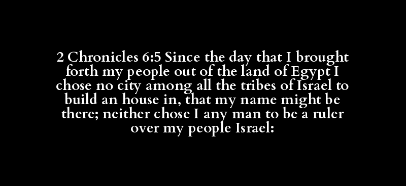 2 Chronicles 6:5 Since the day that I brought forth my people out of the land of Egypt I chose no city among all the tribes of Israel to build an house in, that my name might be there; neither chose I any man to be a ruler over my people Israel: