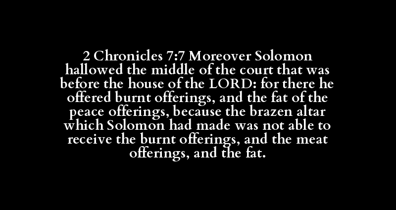 2 Chronicles 7:7 Moreover Solomon hallowed the middle of the court that was before the house of the LORD: for there he offered burnt offerings, and the fat of the peace offerings, because the brazen altar which Solomon had made was not able to receive the burnt offerings, and the meat offerings, and the fat.