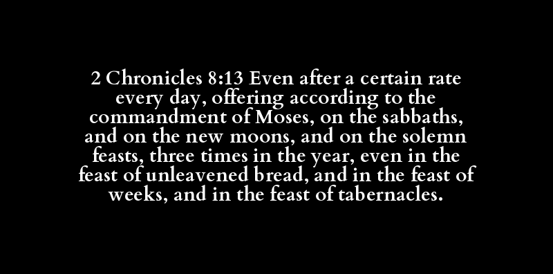 2 Chronicles 8:13 Even after a certain rate every day, offering according to the commandment of Moses, on the sabbaths, and on the new moons, and on the solemn feasts, three times in the year, even in the feast of unleavened bread, and in the feast of weeks, and in the feast of tabernacles.