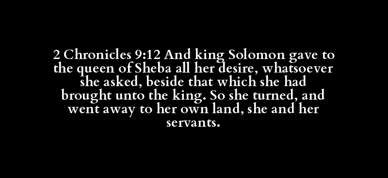 2 Chronicles 9:12 And king Solomon gave to the queen of Sheba all her desire, whatsoever she asked, beside that which she had brought unto the king. So she turned, and went away to her own land, she and her servants.
