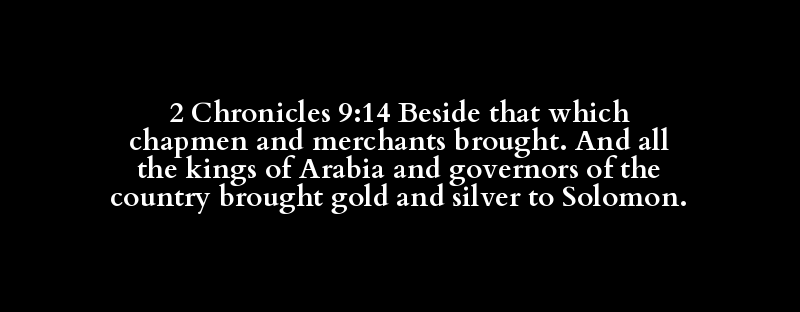 2 Chronicles 9:14 Beside that which chapmen and merchants brought. And all the kings of Arabia and governors of the country brought gold and silver to Solomon.