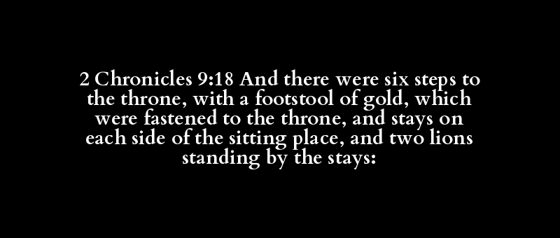 2 Chronicles 9:18 And there were six steps to the throne, with a footstool of gold, which were fastened to the throne, and stays on each side of the sitting place, and two lions standing by the stays: