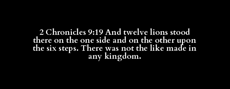 2 Chronicles 9:19 And twelve lions stood there on the one side and on the other upon the six steps. There was not the like made in any kingdom.