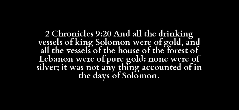 2 Chronicles 9:20 And all the drinking vessels of king Solomon were of gold, and all the vessels of the house of the forest of Lebanon were of pure gold: none were of silver; it was not any thing accounted of in the days of Solomon.