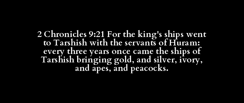 2 Chronicles 9:21 For the king's ships went to Tarshish with the servants of Huram: every three years once came the ships of Tarshish bringing gold, and silver, ivory, and apes, and peacocks.