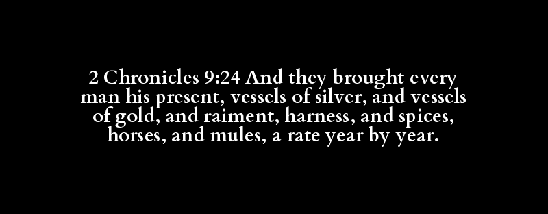 2 Chronicles 9:24 And they brought every man his present, vessels of silver, and vessels of gold, and raiment, harness, and spices, horses, and mules, a rate year by year.