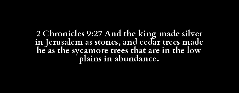 2 Chronicles 9:27 And the king made silver in Jerusalem as stones, and cedar trees made he as the sycamore trees that are in the low plains in abundance.
