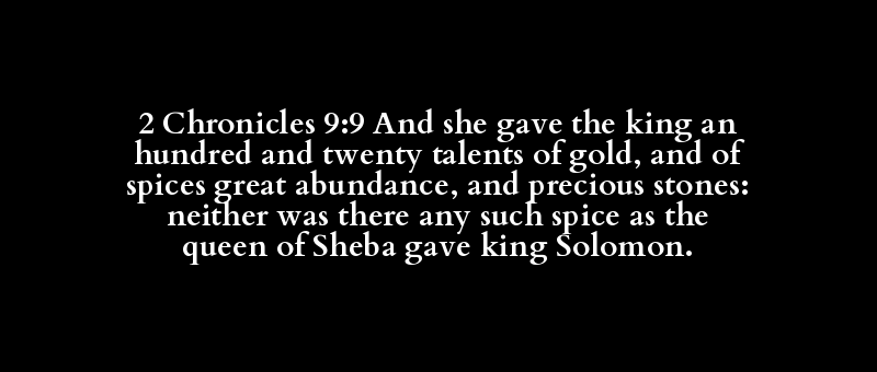 2 Chronicles 9:9 And she gave the king an hundred and twenty talents of gold, and of spices great abundance, and precious stones: neither was there any such spice as the queen of Sheba gave king Solomon.