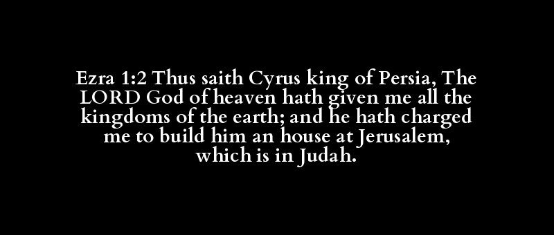 Ezra 1:2 Thus saith Cyrus king of Persia, The LORD God of heaven hath given me all the kingdoms of the earth; and he hath charged me to build him an house at Jerusalem, which is in Judah.