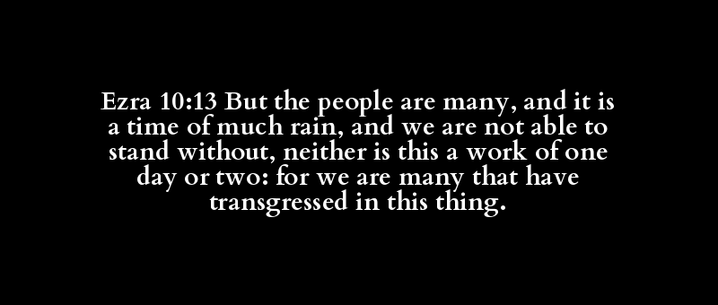 Ezra 10:13 But the people are many, and it is a time of much rain, and we are not able to stand without, neither is this a work of one day or two: for we are many that have transgressed in this thing.