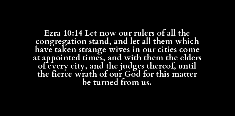 Ezra 10:14 Let now our rulers of all the congregation stand, and let all them which have taken strange wives in our cities come at appointed times, and with them the elders of every city, and the judges thereof, until the fierce wrath of our God for this matter be turned from us.