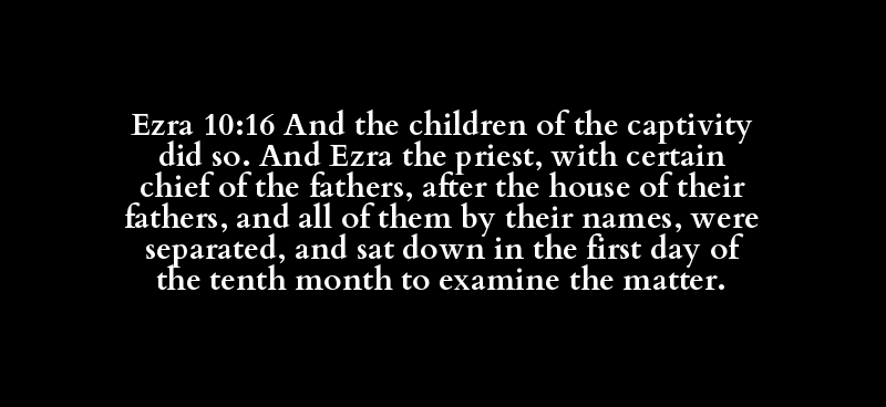 Ezra 10:16 And the children of the captivity did so. And Ezra the priest, with certain chief of the fathers, after the house of their fathers, and all of them by their names, were separated, and sat down in the first day of the tenth month to examine the matter.