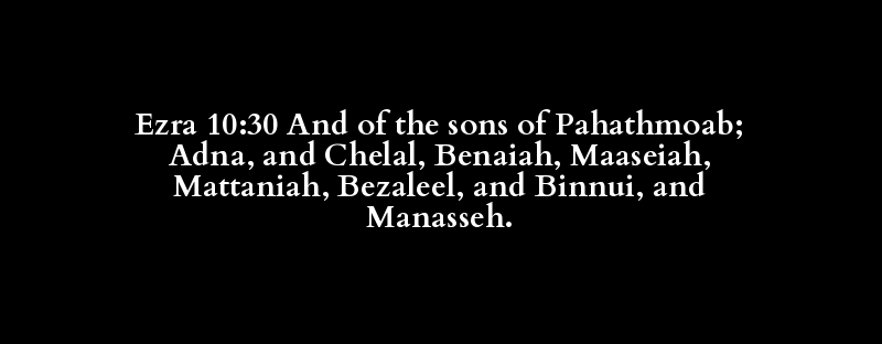 Ezra 10:30 And of the sons of Pahathmoab; Adna, and Chelal, Benaiah, Maaseiah, Mattaniah, Bezaleel, and Binnui, and Manasseh.