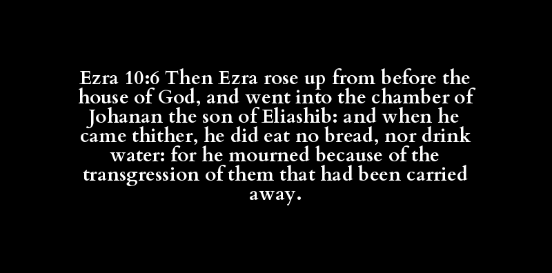 Ezra 10:6 Then Ezra rose up from before the house of God, and went into the chamber of Johanan the son of Eliashib: and when he came thither, he did eat no bread, nor drink water: for he mourned because of the transgression of them that had been carried away.