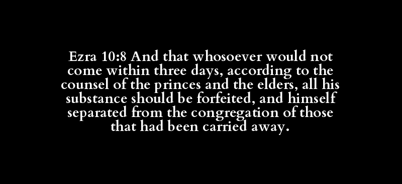 Ezra 10:8 And that whosoever would not come within three days, according to the counsel of the princes and the elders, all his substance should be forfeited, and himself separated from the congregation of those that had been carried away.