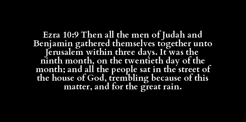 Ezra 10:9 Then all the men of Judah and Benjamin gathered themselves together unto Jerusalem within three days. It was the ninth month, on the twentieth day of the month; and all the people sat in the street of the house of God, trembling because of this matter, and for the great rain.