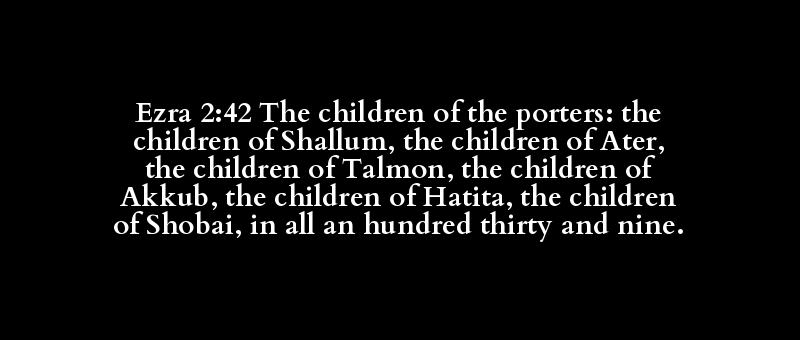 Ezra 2:42 The children of the porters: the children of Shallum, the children of Ater, the children of Talmon, the children of Akkub, the children of Hatita, the children of Shobai, in all an hundred thirty and nine.