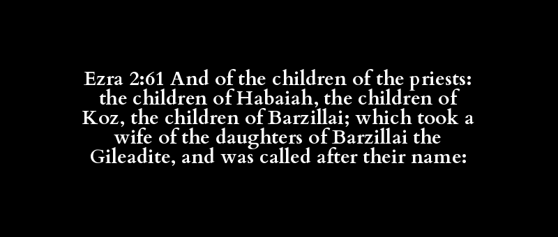 Ezra 2:61 And of the children of the priests: the children of Habaiah, the children of Koz, the children of Barzillai; which took a wife of the daughters of Barzillai the Gileadite, and was called after their name: