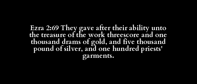 Ezra 2:69 They gave after their ability unto the treasure of the work threescore and one thousand drams of gold, and five thousand pound of silver, and one hundred priests' garments.
