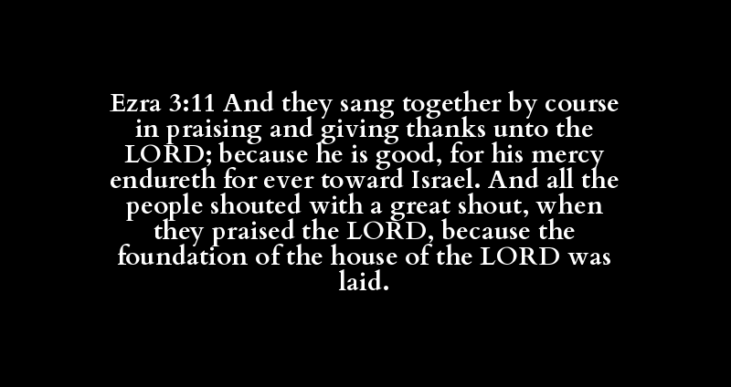 Ezra 3:11 And they sang together by course in praising and giving thanks unto the LORD; because he is good, for his mercy endureth for ever toward Israel. And all the people shouted with a great shout, when they praised the LORD, because the foundation of the house of the LORD was laid.
