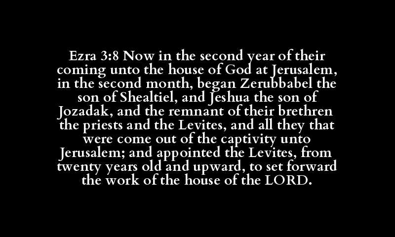 Ezra 3:8 Now in the second year of their coming unto the house of God at Jerusalem, in the second month, began Zerubbabel the son of Shealtiel, and Jeshua the son of Jozadak, and the remnant of their brethren the priests and the Levites, and all they that were come out of the captivity unto Jerusalem; and appointed the Levites, from twenty years old and upward, to set forward the work of the house of the LORD.