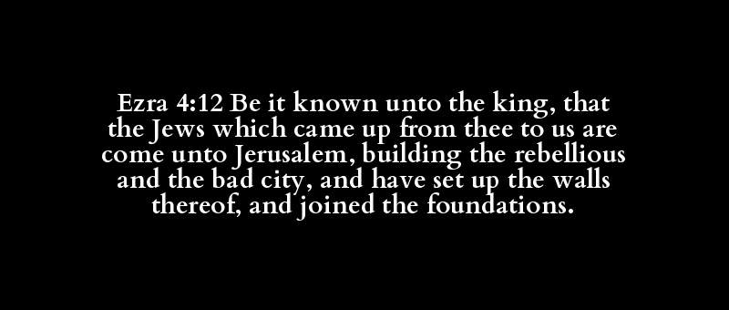 Ezra 4:12 Be it known unto the king, that the Jews which came up from thee to us are come unto Jerusalem, building the rebellious and the bad city, and have set up the walls thereof, and joined the foundations.