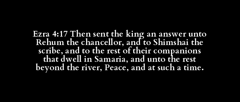 Ezra 4:17 Then sent the king an answer unto Rehum the chancellor, and to Shimshai the scribe, and to the rest of their companions that dwell in Samaria, and unto the rest beyond the river, Peace, and at such a time.