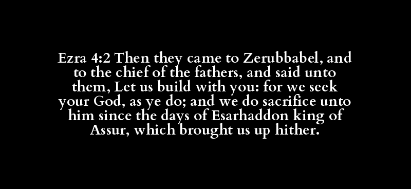 Ezra 4:2 Then they came to Zerubbabel, and to the chief of the fathers, and said unto them, Let us build with you: for we seek your God, as ye do; and we do sacrifice unto him since the days of Esarhaddon king of Assur, which brought us up hither.