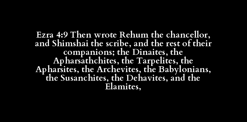 Ezra 4:9 Then wrote Rehum the chancellor, and Shimshai the scribe, and the rest of their companions; the Dinaites, the Apharsathchites, the Tarpelites, the Apharsites, the Archevites, the Babylonians, the Susanchites, the Dehavites, and the Elamites,