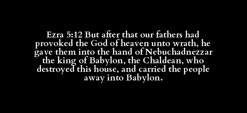 Ezra 5:12 But after that our fathers had provoked the God of heaven unto wrath, he gave them into the hand of Nebuchadnezzar the king of Babylon, the Chaldean, who destroyed this house, and carried the people away into Babylon.