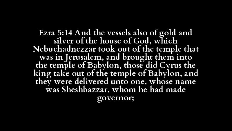 Ezra 5:14 And the vessels also of gold and silver of the house of God, which Nebuchadnezzar took out of the temple that was in Jerusalem, and brought them into the temple of Babylon, those did Cyrus the king take out of the temple of Babylon, and they were delivered unto one, whose name was Sheshbazzar, whom he had made governor;