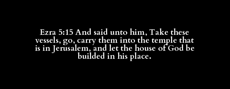 Ezra 5:15 And said unto him, Take these vessels, go, carry them into the temple that is in Jerusalem, and let the house of God be builded in his place.