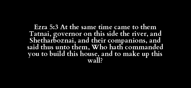 Ezra 5:3 At the same time came to them Tatnai, governor on this side the river, and Shetharboznai, and their companions, and said thus unto them, Who hath commanded you to build this house, and to make up this wall?