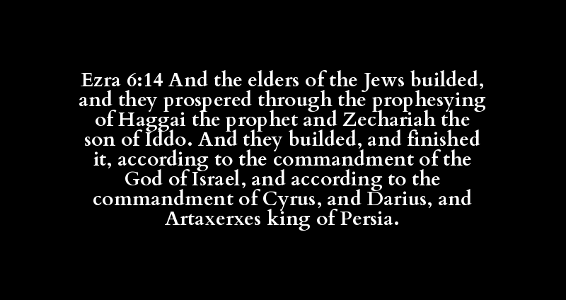 Ezra 6:14 And the elders of the Jews builded, and they prospered through the prophesying of Haggai the prophet and Zechariah the son of Iddo. And they builded, and finished it, according to the commandment of the God of Israel, and according to the commandment of Cyrus, and Darius, and Artaxerxes king of Persia.