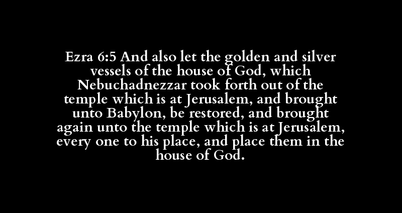Ezra 6:5 And also let the golden and silver vessels of the house of God, which Nebuchadnezzar took forth out of the temple which is at Jerusalem, and brought unto Babylon, be restored, and brought again unto the temple which is at Jerusalem, every one to his place, and place them in the house of God.