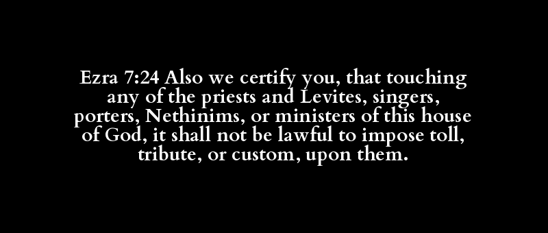 Ezra 7:24 Also we certify you, that touching any of the priests and Levites, singers, porters, Nethinims, or ministers of this house of God, it shall not be lawful to impose toll, tribute, or custom, upon them.