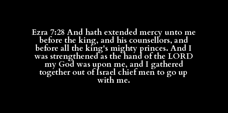 Ezra 7:28 And hath extended mercy unto me before the king, and his counsellors, and before all the king's mighty princes. And I was strengthened as the hand of the LORD my God was upon me, and I gathered together out of Israel chief men to go up with me.