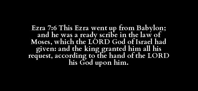 Ezra 7:6 This Ezra went up from Babylon; and he was a ready scribe in the law of Moses, which the LORD God of Israel had given: and the king granted him all his request, according to the hand of the LORD his God upon him.