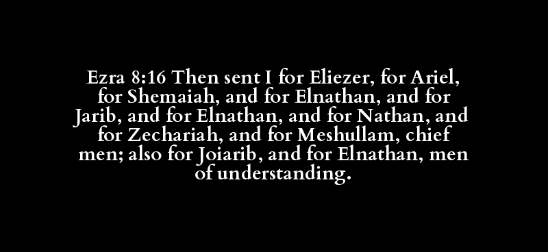 Ezra 8:16 Then sent I for Eliezer, for Ariel, for Shemaiah, and for Elnathan, and for Jarib, and for Elnathan, and for Nathan, and for Zechariah, and for Meshullam, chief men; also for Joiarib, and for Elnathan, men of understanding.