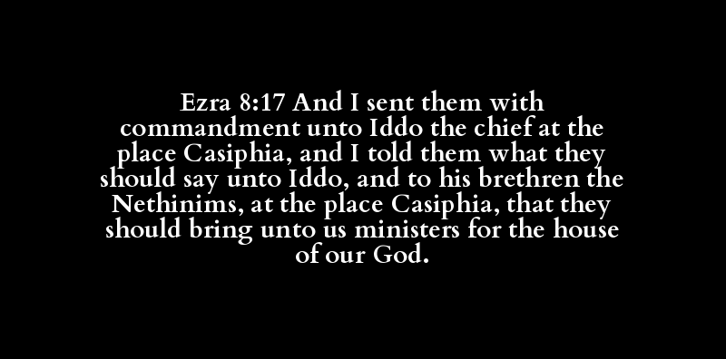 Ezra 8:17 And I sent them with commandment unto Iddo the chief at the place Casiphia, and I told them what they should say unto Iddo, and to his brethren the Nethinims, at the place Casiphia, that they should bring unto us ministers for the house of our God.